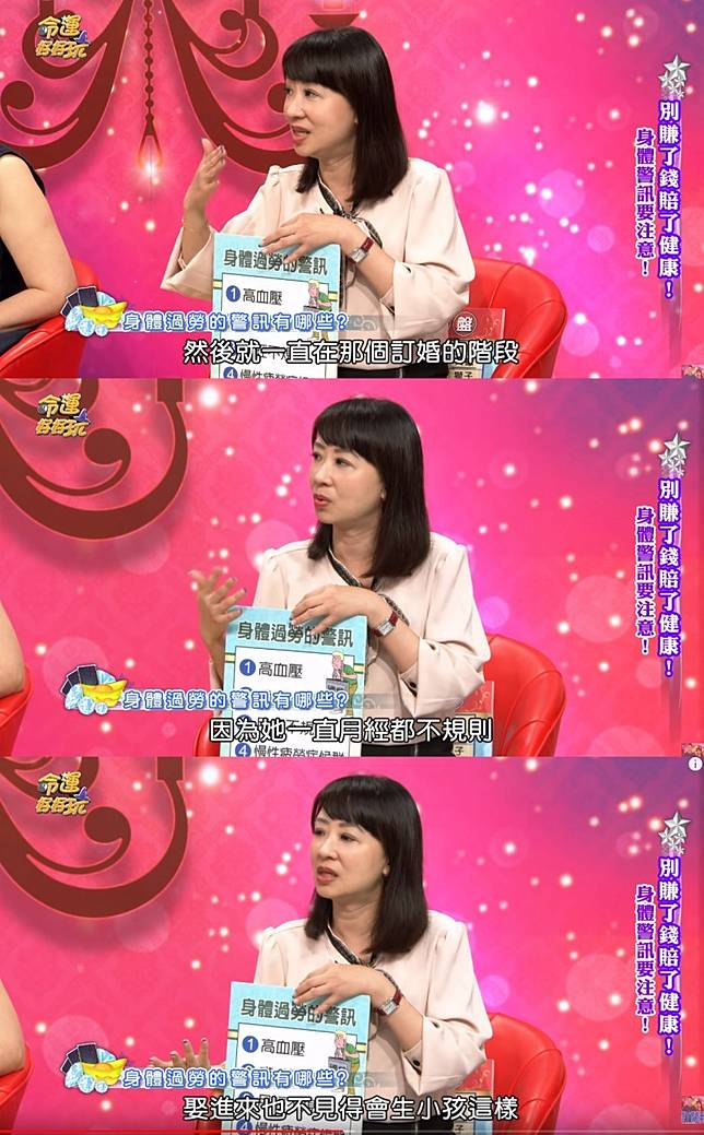 營養師劉怡里在節目《命運好好玩》中分享,有名女生有月經不規律的問題,原本已和男友訂婚,沒想到未來婆婆知道她的身體狀態,就說娶這個媳婦也不曉得能不能生小孩,因此她和男友就因為這樣一直停留在訂婚階段,過了3年仍舊無法結婚。