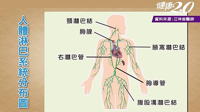 除了摸脖子之外,江坤俊醫師建議,還有2個地方也要常自摸,一個就是「腋下」,因為乳癌最常在腋下,另一個是大腿內側兩邊的「腹股溝」。倘若淋巴結變大後又變小,就可能只是感染病毒,或是感冒所引起的腫塊。