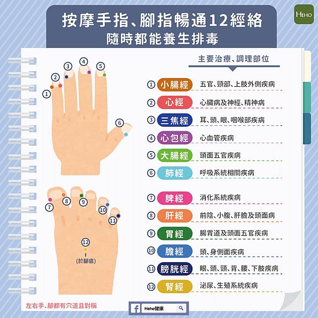 人體的每條經絡都有對應的部位,可以治療、調理某些疾病。想要養生排毒又覺得有點難做到嗎?其實有個最簡單的保養方式,就是按摩手指與腳指。因為人體的手指與腳趾末梢,其實就是12經絡的終點,平常只要按壓手指與腳趾就能通經絡,讓淤積在末梢的氣血循環更順暢,改善與經絡相聯繫的身體部位的不適症狀。