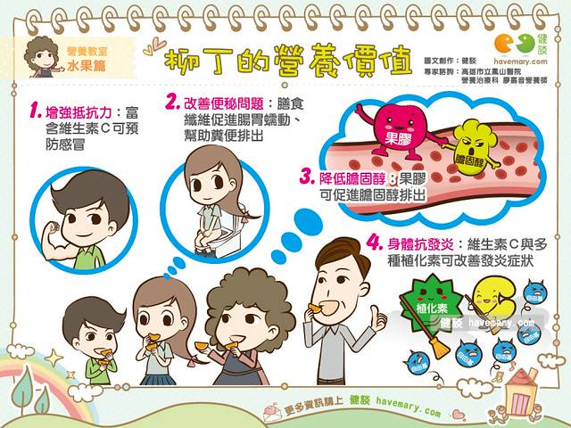 身體抗發炎:柳丁中的維生素C與多種植化素具有強大的抗氧化力,有助於清除體內的自由基,亦可達到抗發炎的效果。