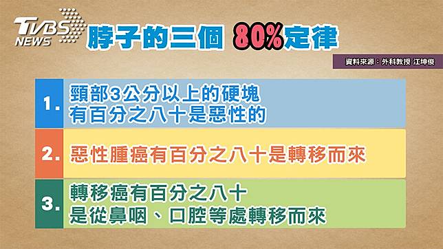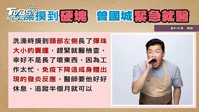 節目主持人曾國城手上多達5個節目,工作忙碌讓他休息不夠導致免疫力下降,身上長異物。日前洗澡時,他在脖子左側摸到彈珠大小的囊腫,原以為是自己「肩頸痠痛」導致,結果診斷後為身體發炎反應,幸好檢查後發現並無大礙,不需要開刀自己就會慢慢消掉。基隆長庚外科教授江坤俊表示:「因為脖子前面淋巴特別多,是身體健康的前哨站,所以身體一有狀況時,就很容易在這些地方有腫塊。」大部分的人感冒時,會感覺到脖子上的淋巴發炎、腫大且按壓時會有疼痛反應,但一般淋巴發炎腫大的狀況會在直徑兩公分內,超過兩公分則須加以注意。除了觸摸脖子前面外,脖子後方也是民眾自我檢查的重點!臨床上有所謂三個八十定律,當頸部出現3公分以上的囊腫,有百分之八十是惡性的,而惡性腫瘤之中有百分之八十是轉移來的,從癌症從鼻咽或口腔轉移到身體各部位的機率有百分之八十。」民眾需特別注意。