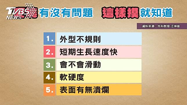 身體的前哨站,除了脖子,另一個重要的地方就是腋下。醫藥記者梁惠雯身邊就有個朋友,按摩時發現腋下長出淋巴結,求診後竟已是乳癌第四期。因此梁惠雯建議,大家平時可以做些自我檢查,當發現身體有「異常硬塊」時,可以先用手去感受它的狀況。大致上來說,惡性腫瘤的外型大多長得不規則且凹凸不平。腫塊中心會有潰爛的現象,還會與周圍的組織相黏,向外擴散,所以用手推動時是不會滑動的。另外,惡性腫瘤生長速度快,比如腫塊本來是1公分,一個月後再觸摸有可能就變成1.5到2公分,當發現這種短期生長速度快的硬塊,就必須要盡快就醫!