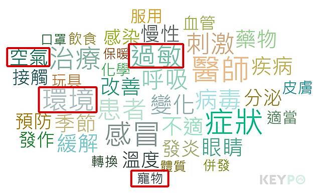 透過《KEYPO大數據關鍵引擎》調查「換季困擾」的關鍵字,可以發現「空氣、過敏、寵物」所帶來的各種不適症狀都會造成生活不便,甚至會產生過敏及慢性發炎等症狀,根據耳鼻喉科醫師蘇育儀的說法,除了呼吸道的影響,心血管疾病和其他慢性疾病都是需要注意的狀況,以下就針對幾個生活中常見的過敏原,告訴大家能夠減緩或改善過敏症狀的方式。