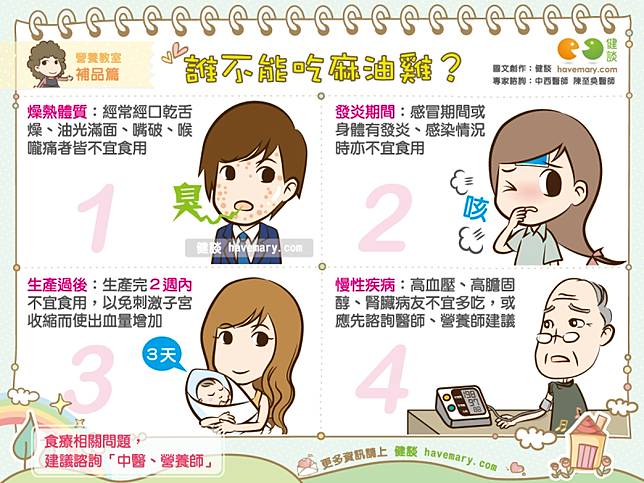 4. 慢性疾病:麻油雞屬於高蛋白、高油脂料理,故若有高血壓、高膽固醇、或具有腎臟疾病者不宜多吃,或先諮詢醫師、營養師建議再食用。