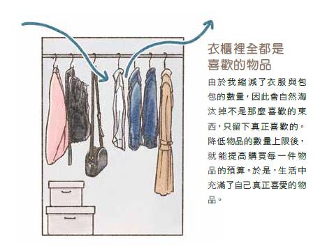 由於我縮減了衣服與包包的數量,因此會自然淘汰掉不是那麼喜歡的東西,只留下真正喜歡的。降低物品的數量上限後,就能提高購買每一件物品的預算。於是,生活中充滿了自己真正喜愛的物品。