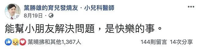 被眾多爸媽們稱為「天使醫師」的小兒科醫師葉勝雄,去年傳出身體不適,在停診一年之後,近日因為癌症過世,享年42歲,讓許多爸媽十分不捨。而葉勝雄在今年8月時,曾在臉書上留下「能幫小朋友解決問題,是快樂的事。」這句話,現在看來特別令人鼻酸。