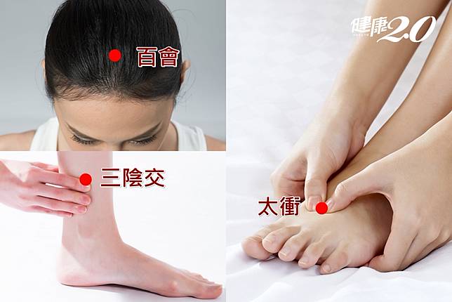 以中醫觀點來看,更年期常有「陰虛陽亢」的現象,像是盜汗、燥熱、脾氣暴躁等症狀,中醫師吳明珠表示,這種情形需要舒緩肝經,可以藉由腳掌上的太衝穴、頭頂的百會穴、腳踝的三陰交穴來改善,舉凡按壓、泡腳等方式都有效果。