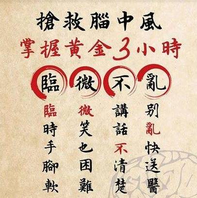 楊敬譽表示,所謂「臨微不亂」是當病患出現「臨」時手腳癱軟、單側手腳無力、無法舉起;臉部表情不對稱,「微」笑困難;說話口齒「不」清,無法完整表達語意。如果有以上症狀,旁人千萬不要慌「亂」,記下病患發作時間盡快送醫。