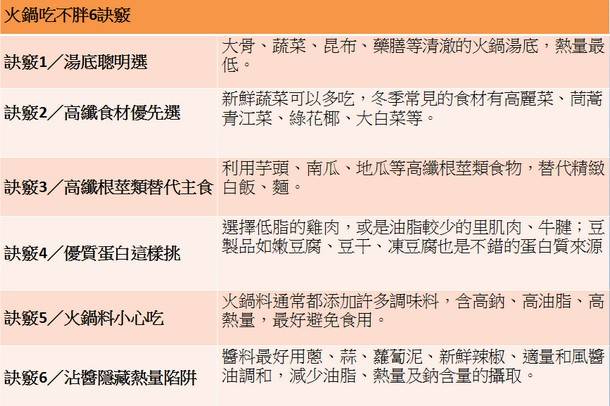 營養師提醒,吃火鍋若能拿捏份量、掌握飲食小技巧,了解選擇湯底、火鍋配料、肉品、醬料的6大訣竅,不僅能吃得健康美味、營養均衡,還能減少攝取過多熱量、油脂的發胖危機。