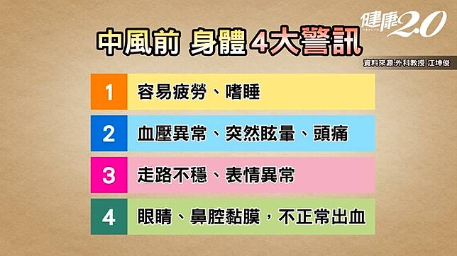 江坤俊醫師表示,不是每一個快中風的人都會手腳沒力或癱掉,有時患者可能只是走路稍微搖搖晃晃,像小碎步一樣,走路有點飄飄的,也要警覺。若是老年人的步態突然變化,並伴隨半側臉部或肢體無力、麻木或偏癱,就要嚴重懷疑是腦血栓的信號。