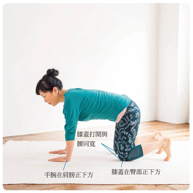 1 從金剛坐的姿勢開始,將臀部抬起、四肢著地,吐氣時立起兩腳的後腳跟,只用腳尖著地。