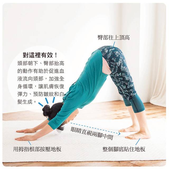 對於想永保青春美麗的女性來說,皺紋及白髮是避之唯恐不及的敵人。在拚命塗抹高價保養品以及去美容院染髮之前,先以下犬式提高頭部血液循環,努力保持肌膚與頭髮的光澤吧!