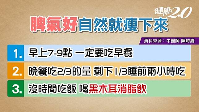 陳峙嘉指出,脾就像銀行存款,每天要固定開門,讓營養進來,才能按時運作。依據中醫理論,一天12個時辰對應到人體的12條經絡,早上7-9點走到「胃經」,9-11點走到「脾經」,在7-9點這個時段吃早餐給身體能量,可啟動全身的新陳代謝功能,體內才有足夠能量燃燒多餘脂肪,有機會達到瘦身效果。