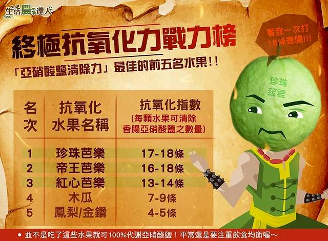 農委會表示,維生素C、維生素E、多酚類(茶多酚、還原糖)、多醣類(膳食纖維)、有機酸類(檸檬酸、蘋果酸)、類黃酮(胡蘿蔔素)等物質都有清除自由基的能力,這些物質的含量愈高的水果,「亞硝酸鹽清除力」就愈好。農業試驗所鳳山分所針對29種水果做取樣測試,發現清除亞硝酸鹽能力最強的水果前三名都被芭樂包辦了。