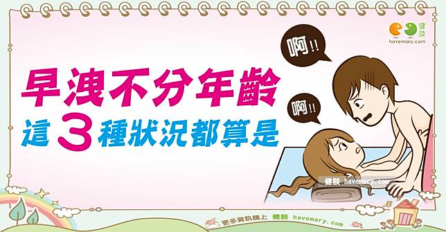 早洩可能是許多男性心中的痛,無法享受魚水之歡,甚至成了心理壓力,到底什麼樣的情況才算是早洩呢?台北市立聯合醫院仁愛院區泌尿外科黃建榮醫師表示,若性行為的時間太短、無法控制射精時間、射精造成心理負面影響等任一狀況時,就代表已有早洩問題,建議及早就診接受治療為佳喔。