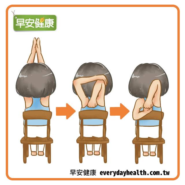 舉手過頭拉手肘、雙手背後互拉,改善肩頸僵硬酸痛