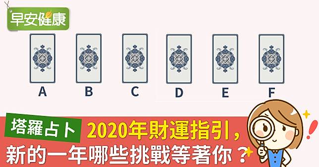 【早安健康/王彥文報導】新的一年即將到來,對於未來十二個月的主要命運流向、以及每個人都關心的財運,是否感到想要先看為快呢?從古代埃及傳承而來的 塔羅占卜術,帶大家提早為2020年做準備。請在心中冥想著:「未來將會是怎麼樣的一年?」,直到思緒清明後,在下面的六張牌中選出一張。