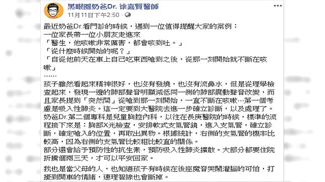 徐嘉賢分享近日遇到的案例,一位家長向他表示,「醫生,他咳嗽非常厲害,都會咳到吐」、「自從他前天在車上自己吃東西嗆到之後,從那一刻開始就不斷在咳嗽」。