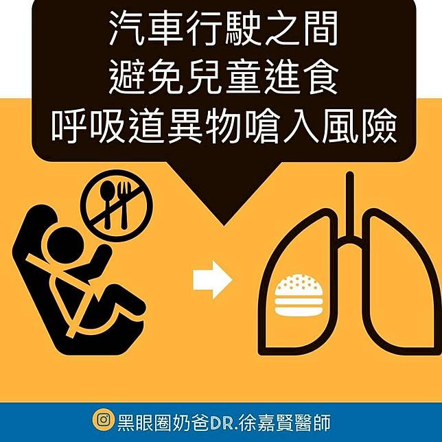 開車載小孩出門的時候,你會給小孩在車上吃東西嗎?兒科醫師徐嘉賢在臉書粉專「黑眼圈奶爸Dr. 徐嘉賢醫師」發文提醒,如果小孩在車輛行進當中進食的話,恐會造成吸入性肺炎!