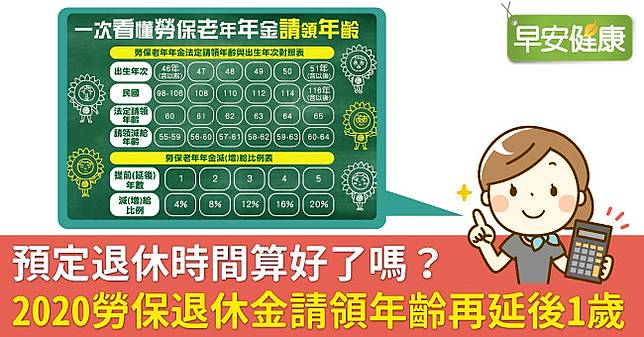 【早安健康/余宗翰報導】勞工看過來,明年起勞保老年年金法定請領年齡又提高一歲!到了年底,勞保年金又成了熱門焦點,48年次的人可能以為明年就可以領勞保年金了,但因為勞保年金的領取年齡調高一歲至62歲,48年次的人要等到後年2021年才能領取;另外,50年次的民眾,雖然要等到2025年才能領到勞保年金,但因為勞保年金可以提前5年請領「減額勞保年金」,所以50年次的人明年2020年就要考慮是否要提前請領。提前一年領年金,年金總額會扣4%,扣到20%為止。