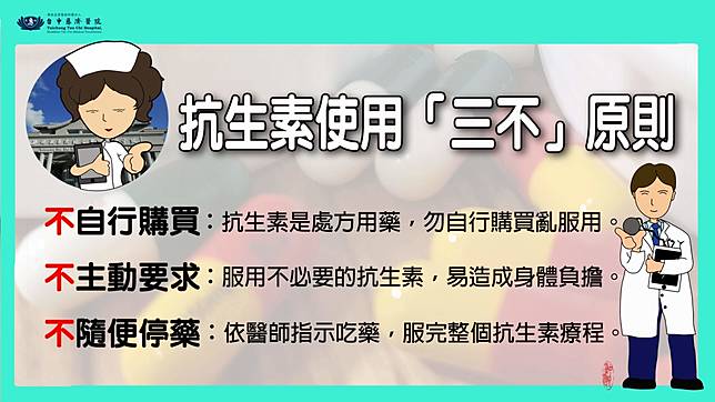 王瑞興表示,只要掌握「不自行購買、不主動要求、不隨便停藥」抗生素正確使用的三不原則,不僅能安心使用抗生素完成疾病治療,也能避免細菌產生抗藥性。若有過期或未吃完的抗生素、免疫抑制劑、荷爾蒙藥物,王瑞興也建議送回原發藥處回收,避免汙染環境。