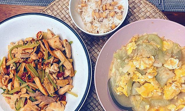 能自己做晚餐時,林可彤大推蓋飯,只要炒一道有菜有肉的料理,像是空心菜牛肉、芥蘭牛肉,鋪在五穀飯上,一次就能吃到足夠的蛋白質、碳水化合物與蔬菜。「很省時,兩個人的份量也好拿捏。」時間充裕時,就再熬一鍋蔬菜雞湯搭配。
