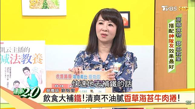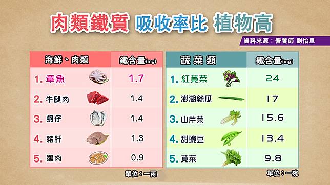 營養師劉怡里指出,從食物而來的鐵很特別,當身體缺鐵時,它的吸收率就會增加,譬如動物性的鐵,人體的吸收率是25%,但身體很缺的時候,就會提高到40%,可是當身體不缺的時候,一樣補鐵的話,就只有25%,所以身體是一個平衡機制。如果是補充錠劑的話,就有可能會過量。而食物中含鐵質最高的是章魚,而不是大家以為是紅肉中的牛肉。