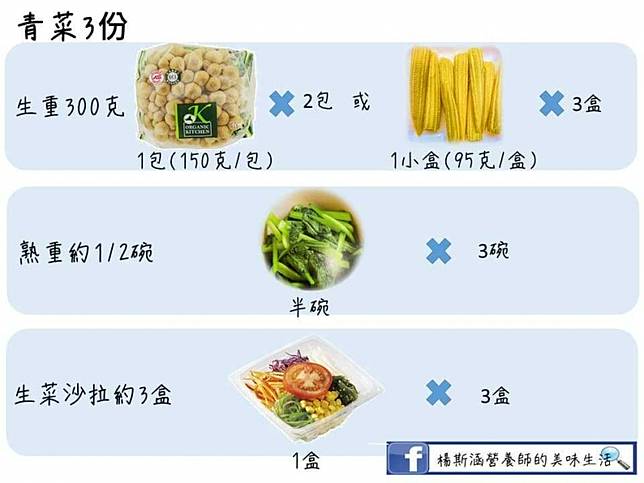 營養師楊斯涵表示,青菜富含膳食纖維、維生素及礦物質,建議一天要吃到3份蔬菜,大概一天需要300公克的青菜,不限種類或顏色。以居家烹調來說,超市一包鴻喜菇或一盒玉米筍約100公克,一天需要3包(盒)的量,而綠葉蔬菜約250到300公克,一天至少需要一包的量。