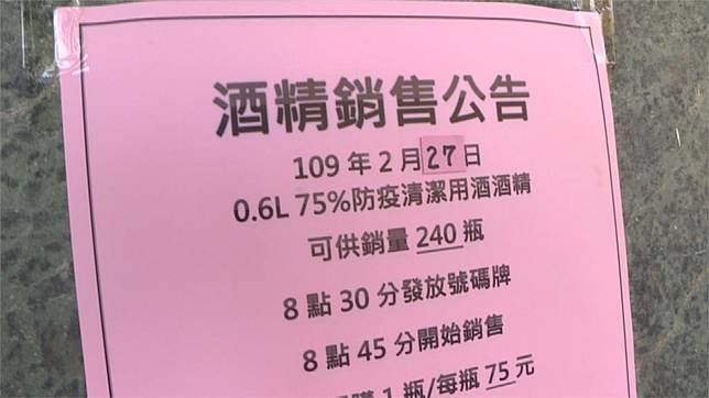 在高雄市同盟路的菸酒公賣局販售處,一早就出現排隊人潮,今天又是販賣75%消毒酒精的日子,販售處會不定期貼出紅紙通知,有注意訊息的民眾,一早就來這邊排隊,今天供應量只有240瓶,每瓶0.6公升,一瓶75元卻來了超過300人以上。