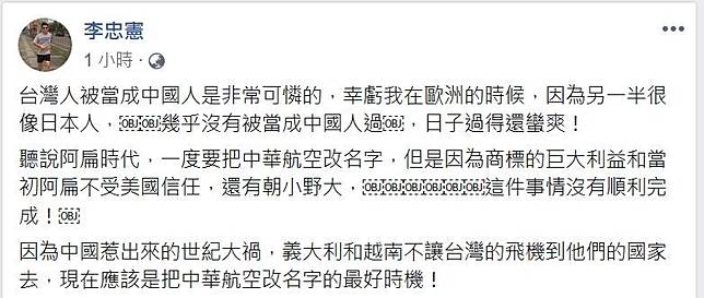 向來關心國家時事又直言的成大教授李忠憲今(1)日在臉書有感而發表示,聽說阿扁時代,一度要把中華航空改名字,但是因為商標的巨大利益和當初阿扁不受美國信任,還有朝小野大,這件事情沒有順利完成。