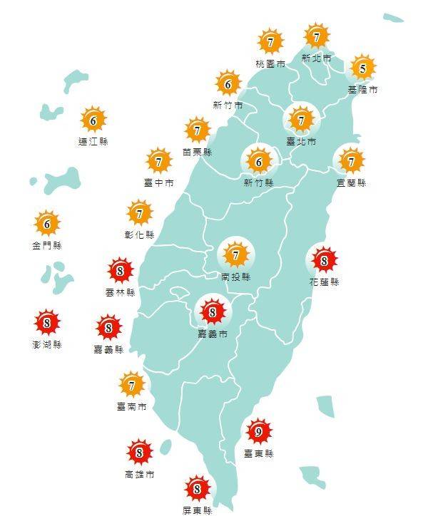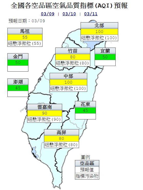今日空氣品質部分,凌晨至上午西半部各地風速微弱,擴散條件較差,污染物易累積;午後西南風風速增強,竹苗以南地區擴散條件將明顯好轉。北部地區因位在下風處,須留意污染物易累積,且受光化作用影響,臭氧濃度易上升;宜蘭、花東空品區及金門、澎湖地區為「良好」等級;北部、竹苗、中部、雲嘉南、高屏空品區及馬祖地區為「普通」等級。另外,中部、雲嘉南局部地區於清晨至上午期間可能達橘色提醒。