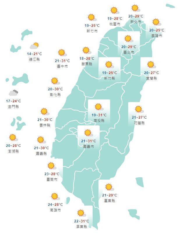 〔即時新聞/綜合報導〕今日清晨各地低溫大部分都在19度以上,白天風向為偏南風,各地天氣穩定,僅山區有零星短暫雨,氣溫偏高,白天各地高溫都在27度以上,其中大台北地區、中南部地區及台東甚至會出現30度左右高溫。
