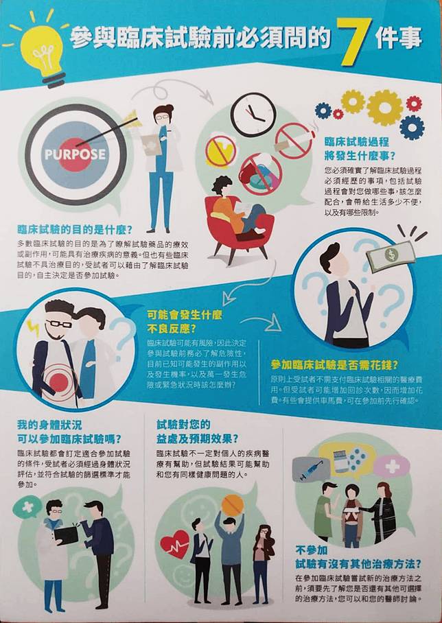 張連成說,建議在參加臨床試驗前一定要問清楚自己有什麼權益、有什麼義務,建議可以從以下7個問題來詢問。