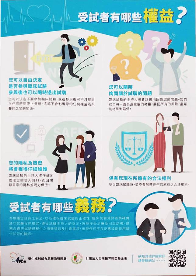 而謝燦堂則說,在參與臨床試驗前,一定要跟醫師、醫師的團隊有充分的溝通,「如果一個醫師不願意跟你溝通,那就不要做了,因為他顯然是不負責任的醫師。」