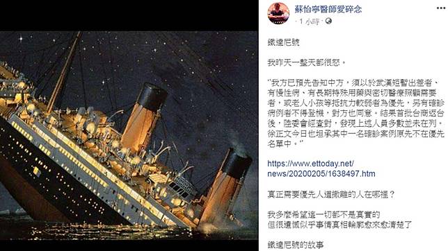 日前首批滯留武漢的247名台人搭乘包機返台,事後有1人被確診感染新型冠狀病毒,更爆出有3人並不在原本的起飛名單內,是臨時加上去的,讓湖北台灣同胞返台救援會會長徐正文遭各界砲轟!醫師蘇怡寧今(6日)發文怒轟,將整起事件拿來和「鐵達尼號」故事對比,氣憤表示對人性感到失望。