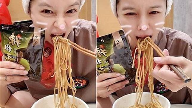 藝人搶攻乾拌麵市場又多1位,金曲歌王「老蕭」蕭敬騰近日推出即食快煮麵,徐若瑄為了力挺好友,特地在臉書上貼出自己戴上髮帶吃麵的素顏照,已44歲的她做出各種搞怪表情絲毫沒違和感。