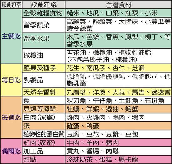 雖然是地中海沿岸國家的飲食習慣,不過按照食物特姓,在台灣也能輕易進行地中海飲食法,高雄醫學大學營養部黃泰傑營養師就整理出,以台灣食材為主的地中海食物圖表,只要按照圖表上來準備及攝取就可以囉!