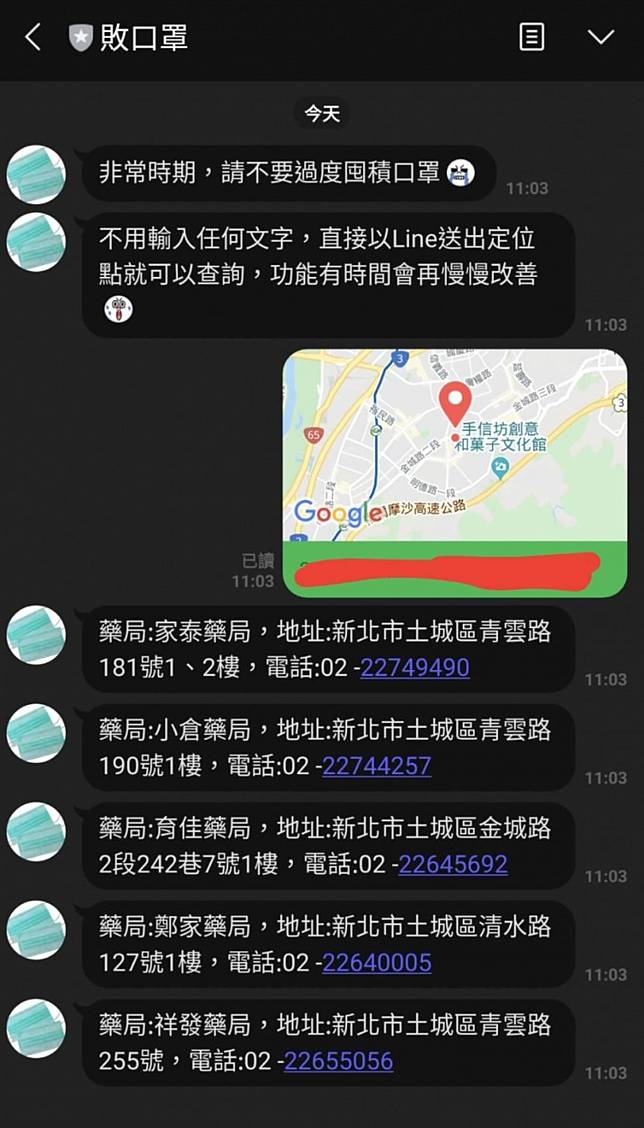 先加入這個由PTT網友製作的LINE機器人帳號,在聊天室點選左下角「+」,分享「位置資訊」,就可以獲得附近藥局資訊,相當便利。