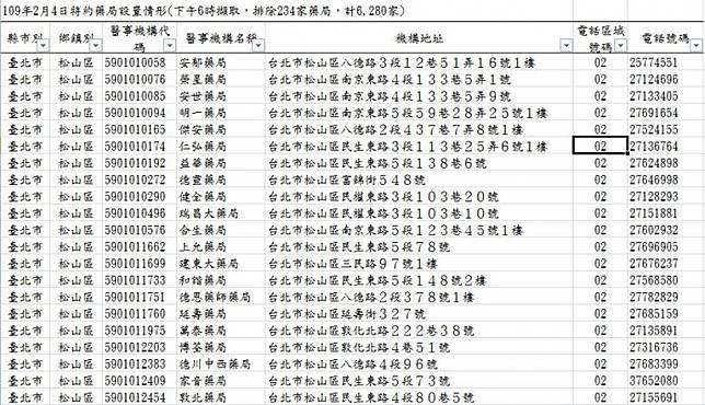可選擇「名單下載」下載特約藥局名單表格(xlsx檔),檔案內含全台特約藥局名稱、電話及地址等資訊,可在名單中以搜尋功能(ctrl+f開啟或使用軟體內搜尋功能)尋找目標地藥局。