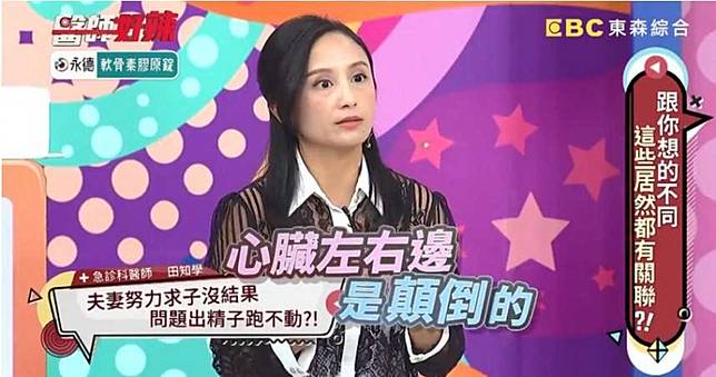 田知學表示,這位老公的精子數量少之又少,照了X光發現心臟左右是顛倒的,再做全身檢查驚覺「全身很多地方都是顛倒的」。這樣的症狀被稱作「卡塔格氏症候群」(Kartagener syndrome),主要是男患者身體有纖毛的地方不會動,而精子要排出來需要纖毛運動,但因為精子尾巴的活動力太差,所以很多精子都沒有出來,根據統計,男性若是有這樣的症狀,要讓女性懷孕生子的比例不到一半。