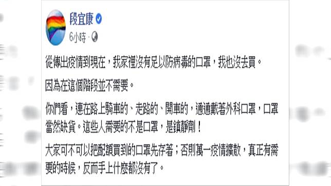 針對全民搶購口罩的亂象,段宜康4日在Facebook發文表示,從傳出疫情到現在,他家都沒有足以防病毒的口罩,而他也沒有去買口罩,「因為在這個階段並不需要。」