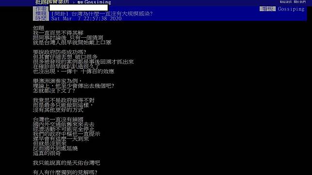 但原PO又說仔細去想,破口很多,很多被發現的案例都是事後回溯才抓出來,在確診前早就趴趴造很久了,也沒出現一傳十、十傳百的效應,反而國外到處延燒,直說「台灣疫情管控良好是因為天佑台灣吧!」