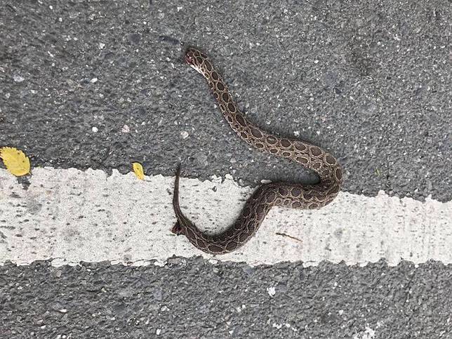 民眾將照片上傳到臉書社團「台東大小事」,,被輾斃的鎖鍊蛇長逾1公尺,身軀約成人般手臂粗大,民眾表示,照片是在國立台灣史前文化博物館旁拍攝,而自己的母親27日上午也在知本田裡徒手抓了1隻青竹絲,提醒其他人要多加留意。