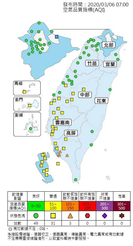 根據環保署空氣品質預報資訊:6日清晨仍受大陸冷氣團影響,白天起大陸冷氣團逐漸減弱,環境風場為東北風至偏東風,西半部位於背風側,擴散條件轉差,南部地區位於弱風區,污染物易累積。宜蘭、花東空品區及澎湖地區為「良好」等級;北部、竹苗、中部、雲嘉南空品區及馬祖、金門為「普通」等級,雲嘉南局部地區短時間可能達橘色提醒等級;高屏空品區為「橘色提醒」等級。