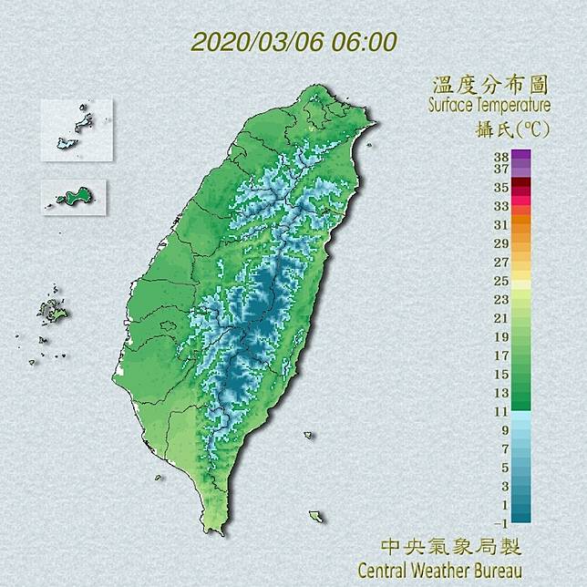 今(6日)清晨仍受冷氣團影響,各地氣溫偏低,西半部普遍低溫在14至17度,竹苗近山區的平地局部低溫13度左右,白天起冷氣團減弱,各地氣溫回升,北台灣及東半部高溫預估約24度,中南部地區高溫約28度左右;天氣方面由於水氣減少,僅東半部和各地山區有局部短暫雨,其他地區大多為多雲到晴的好天氣。