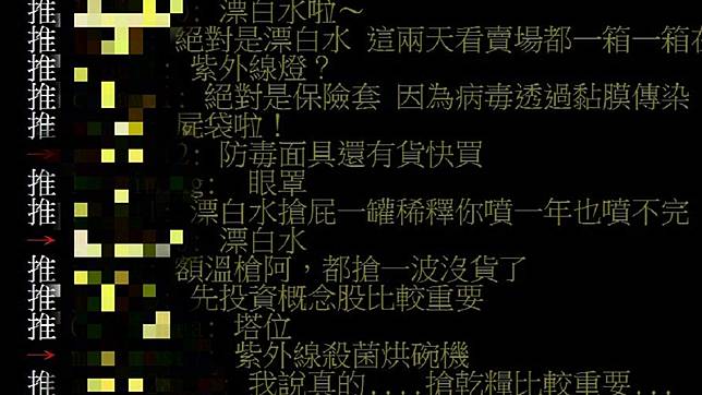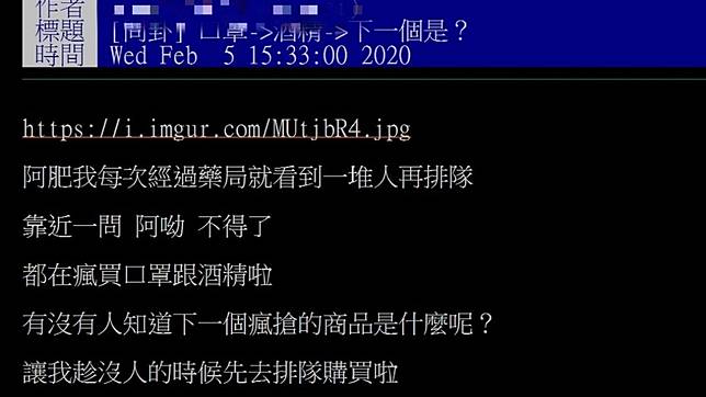 一名網友昨天(5日)好奇在PTT八卦版上以「口罩->酒精->下一個是?」為題發文,內文提到每次經過藥局都看到一堆人排隊瘋買口罩和酒精,好奇詢問「有沒有人知道下一個瘋搶的商品是什麼呢?讓我趁沒人的時候先去排隊購買啦!」
