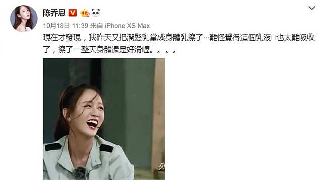 陳喬恩昨日在微博自爆,都已經快中午了,身體都還是滑得不得了,原來是因為前晚洗澡後,又把潤髮乳當成身體乳來擦。她自嘲「難怪覺得這個乳液也太難吸收了,擦了一整天身體還是好滑喔!」