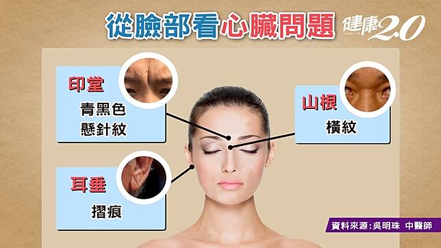 另外,還有兩個地方會顯示出心臟問題,一個是「印堂」出現懸針紋,另一是「山根」出現橫紋。吳明珠解釋,有些人煩惱的時候會皺眉,但若沒有皺眉就有很深的紋路存在,就要小心了,且不只外觀上的紋路,若「印堂發紅」要注意可能血壓比較高,小心中風問題出現,若「印堂發黑」可能表示心血管疾病已經存在有一段時間,而出現「瘀」的狀況。而鼻子「山根」處若有凹陷、橫紋,表示血循狀態不佳。
