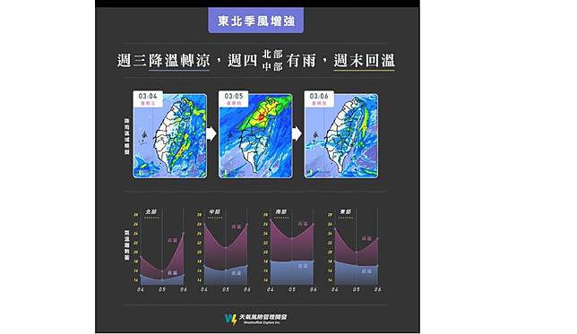 臉書「天氣風險 WeatherRisk」指出,4日東北季風增強將會再有一波降溫,迎風面北部、東北部 將會轉陰雨;配合晚間華南雲帶移入影響,中部雲量增多,也有短暫陣雨。