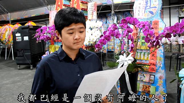 66寫下給阿嬤的信,只寫到一半,眼淚就滑落滴濕信紙。她跪在阿嬤的靈堂前面哭著讀信,「親愛的阿嬤,妳在天上過得好嗎?今天是妳離開我的第15天,妳有想我嗎?我每天都好想妳好想妳,我到今天還是無法相信,以後的每一天,我都已經是一個沒有阿嬤的人了。」